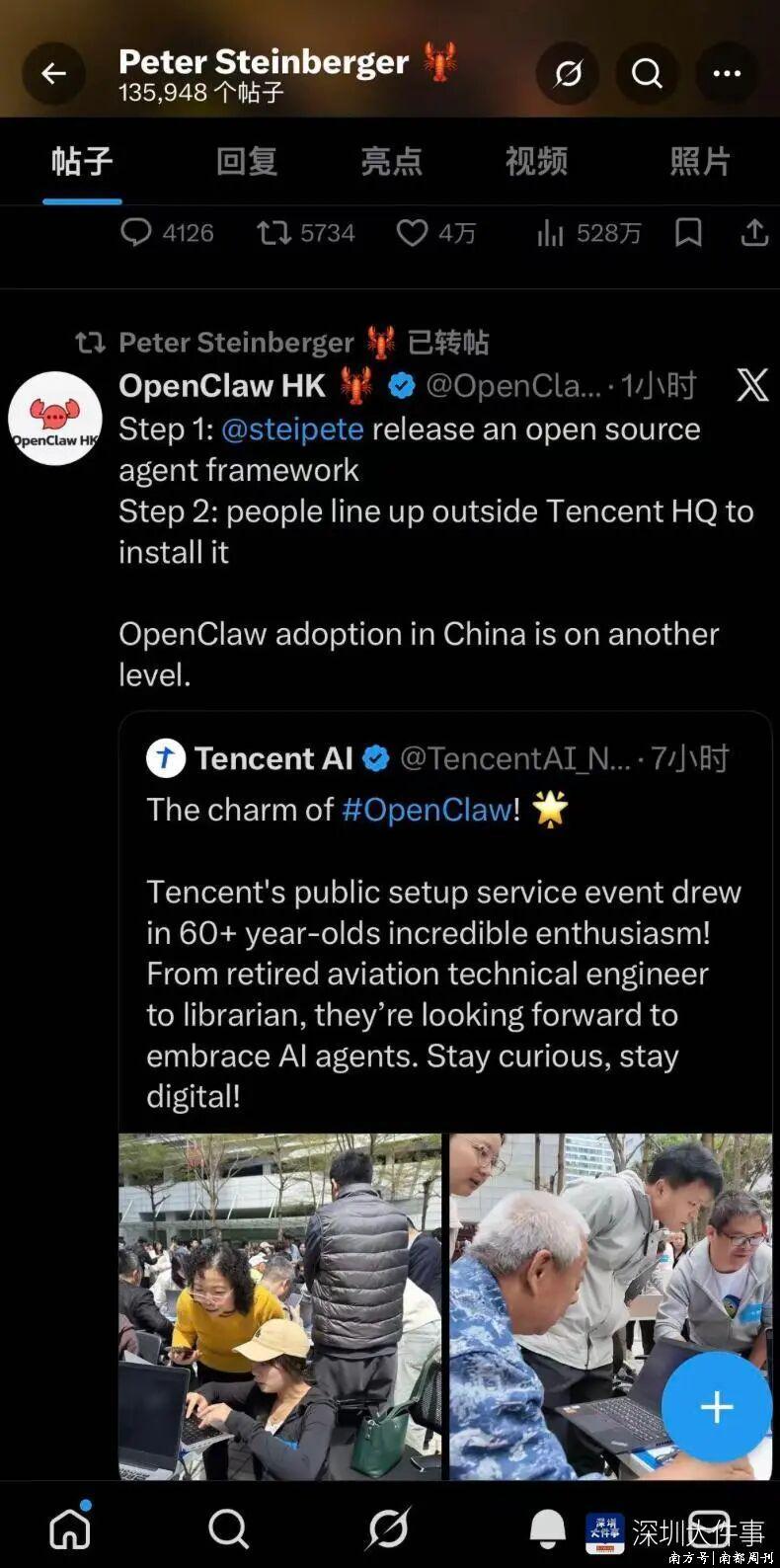 “OpenClaw HK”在社交网络转发深圳腾讯工程师摆摊线下“养龙虾”的帖文称,“OpenClaw在中国的应用已经到达了另一个水平”,OpenClaw 创始人 Peter Steinberger 随后转发了这条帖子。