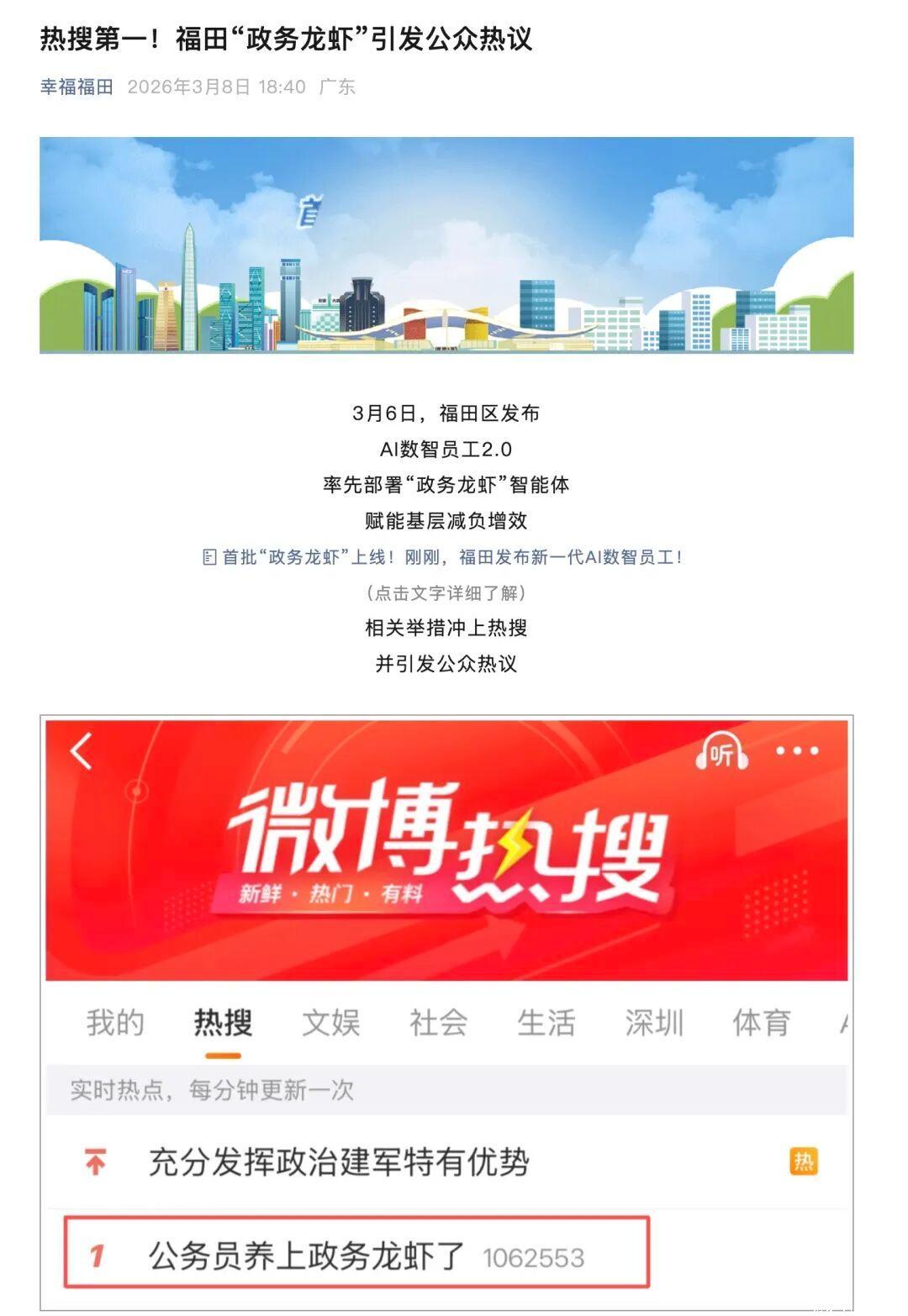 3月7日,话题词#公务员养上政务龙虾了#冲上微博热搜第一,引发热议。据了解,福田区升级AI数智员工2.0,率先基于政务外网本地化部署本土自主研发的“政务龙虾”智能体,掌握多种技能工具,支持一键安装。
